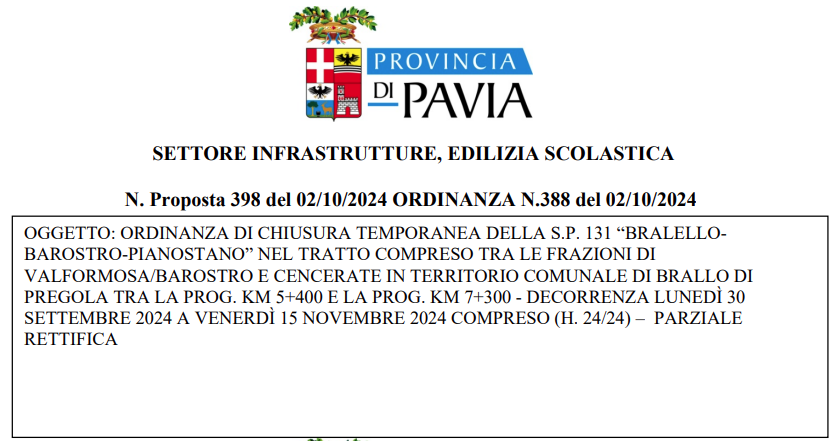 Ordina, conferma e dispone: la chiusura temporanea della S.P. 131 “Bralello-Barostro-Pianostano” nel segmento stradale compreso tra le Prog. Km. 5+400 ÷ 7+300 all’interno del quale ricadono le Frazioni di Valformosa e Cencerate in territorio comunale di Brallo di Pregola giusta la decorrenza di lunedì 30 settembre 2024 a venerdì 15 novembre 2024 compreso (h. 24/24) nel territorio comunale di Brallo di Pregola;