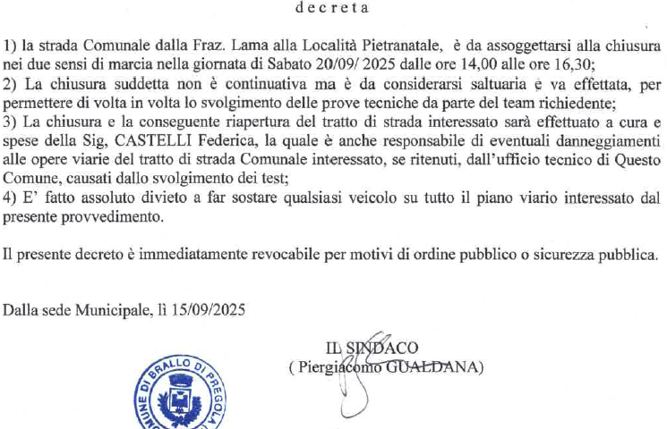 Descrizione chiusura saltuaria della strada Lama - Pietranatale per la giornata di sabato 20/09 Allegati Documenti decreto del sindaco [.pdf 119,16 Kb - 15/09/2025] A cura di Ufficio Vigilanza Ultimo aggiornamento pagina: 15/09/2025 11:05:12
