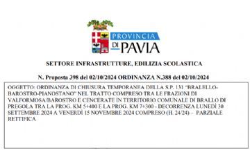 Leggi tuttoRettifica ordinanza della Provincia di Pavia - chiusura tratto di strada
